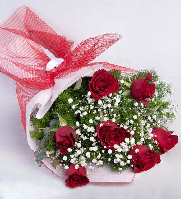 7 adet ithal kesme kırmızı gül. Kaliteli yeşillikler ve kaliteli paketleme malzemesi ile hazırlanmıştır.