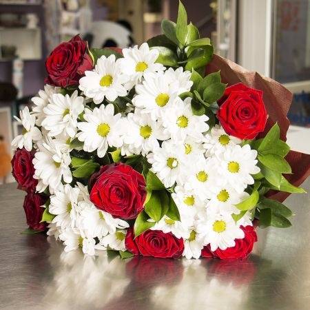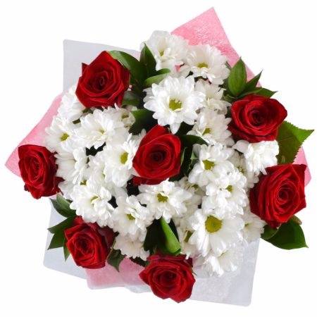 7 Adet Kaliteli kırmızı gül , 5 dal beyaz krizantem ve kaliteli yeşillikler. stok durumuna bağlı olarak çiçek renk ve modelinde değişiklik olabilir.