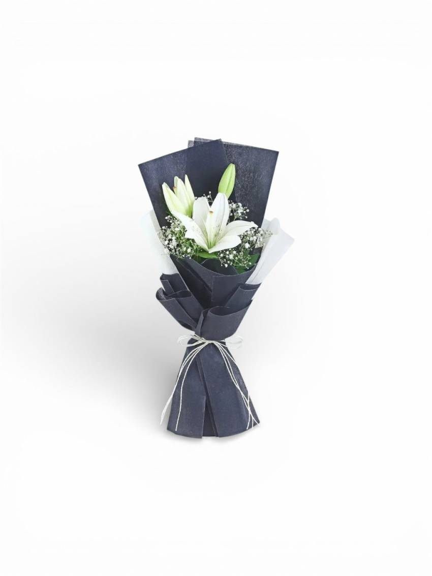 Midnight White Lily Buketi, taze beyaz lilyum çiçekleri ve cipso ile özenle hazırlanmıştır. Modern siyah premium ambalajı sayesinde güçlü, sade ve sofistike bir görünüm sunar.