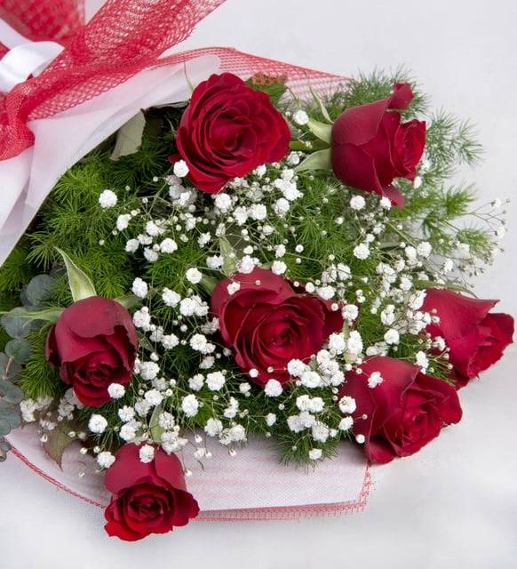 7 adet ithal kesme kırmızı gül. Kaliteli yeşillikler ve kaliteli paketleme malzemesi ile hazırlanmıştır.