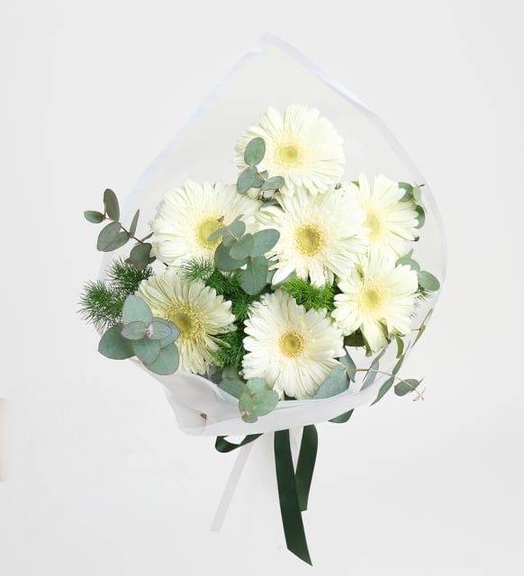 Pure White Gerbera Buketi, taze beyaz gerbera çiçekleri, doğal okaliptüs yaprakları ve yeşil dolgu bitkileri ile özenle tasarlanmıştır. Minimal beyaz ambalajı ve sade bağlama detayı sayesinde hem şık hem de doğal bir görünüm sunar.