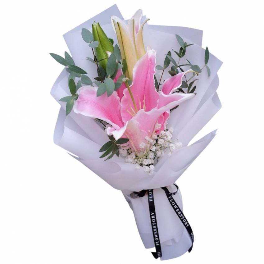 Pink Elegance Lily Buketi, taze pembe lilyum çiçekleri, cipso (gypsophila) ve doğal okaliptüs yaprakları ile özenle hazırlanmıştır. Beyaz özel ambalaj kağıdı ve şık siyah kurdele detayıyla modern ve sade bir görünüm sunar.