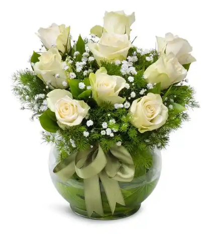 9 adet beyaz gül kaliteli yeşillikler cam fanus ürün boyu yaklaşık 30-35 cm dir stok durumuna bağlı olarak gül rengi farklı olabilir